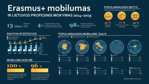 Net 98 % Lietuvos valstybinių profesinių mokyklų aktyviai dalyvauja „Erasmus+“ mobilumo projektuose ir kasmet organizuoja mokymosi mobilumus „Erasmus+“ programos šalyse. Per 2014–2020 metų laikotarpį ne mažiau kaip 2000 profesinių mokyklų mokinių ir mokytojų stažavosi užsienyje.